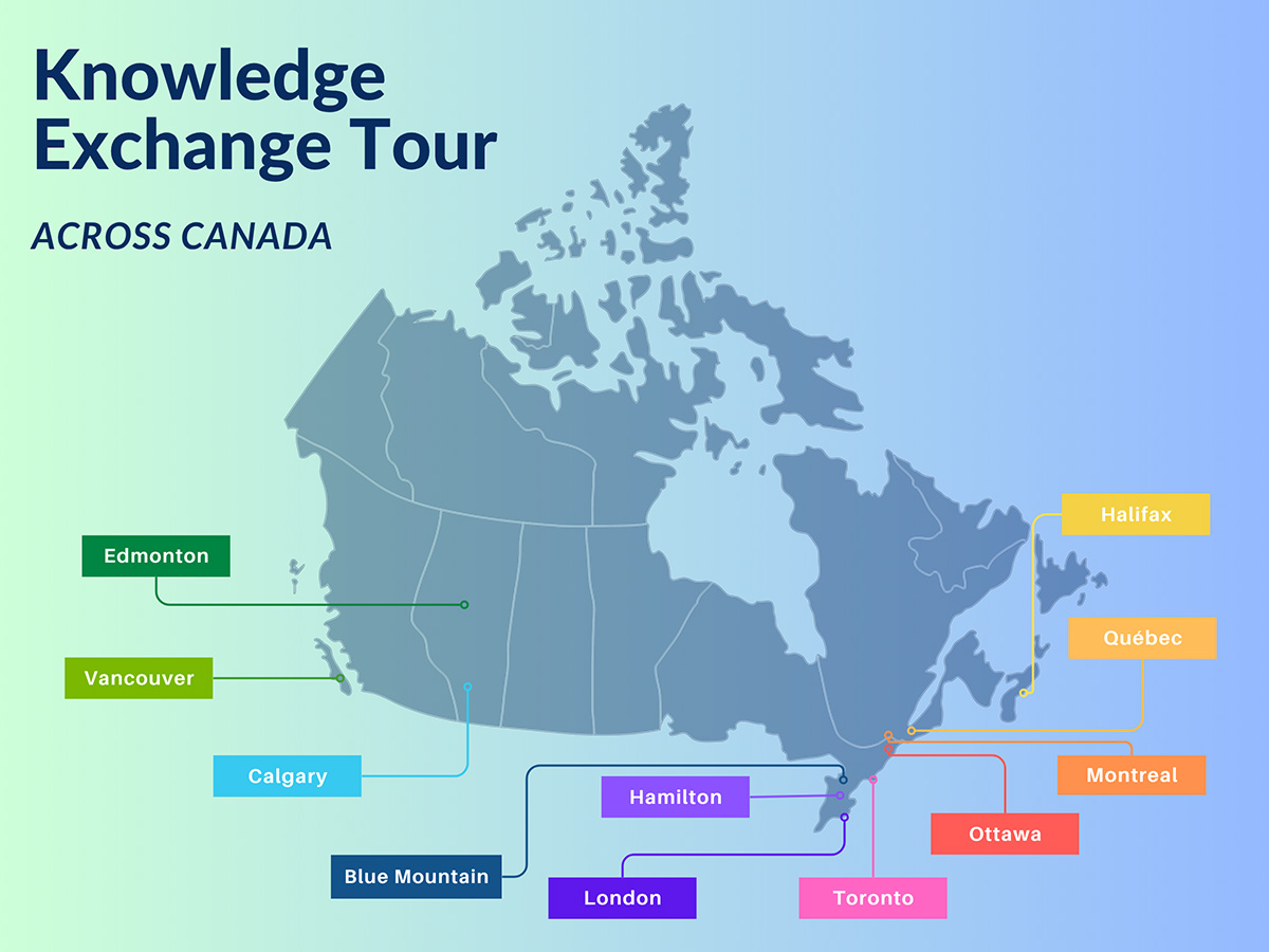 A map of Canada with the title “Knowledge Exchange Tour Across Canada” in dark blue text on the left. The map highlights ten cities across the country, each labeled in a colored box with connecting lines: Vancouver (lime green), Edmonton (dark green), Calgary (light blue), Blue Mountain (dark blue), London (purple), Hamilton (violet), Toronto (pink), Ottawa (red), Montreal (orange), Québec (yellow-orange), and Halifax (yellow). The background has a gradient from light green on the left to light blue on the right.