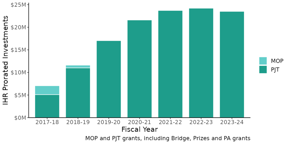IHR investments may vary annually and over time, as they are calculated based on in-year IHR-relevant expenditures relative to total CIHR Grants and Awards expenditures. Sustaining these investments depends on a steady flow of new IHR-relevant applications, highlighting the importance of continued capacity-building in IHR.
