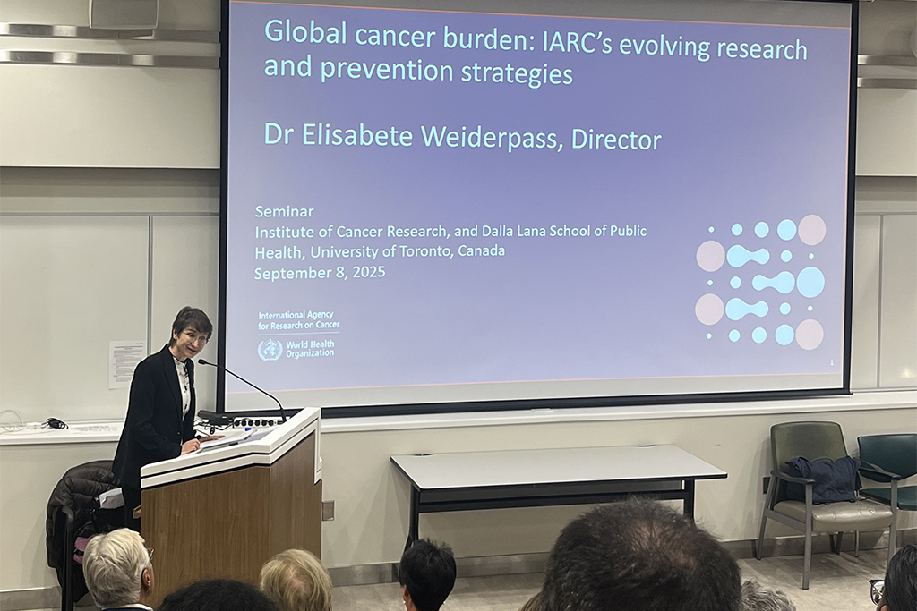 Au début du mois, j’ai eu le privilège d’accueillir la directrice du CIRC, la Dre Elisabete Weiderpass, à titre de professeure invitée au Canada. Lors de sa visite d’une semaine, la Dre Weiderpass s’est rendue à Toronto et à Ottawa, faisant profiter le milieu de la recherche sur le cancer du Canada et des membres importants du gouvernement fédéral de sa vaste expérience et de ses connaissances fines des initiatives du CIRC. Je tiens à lui témoigner toute ma gratitude pour le temps qu’elle a consacrée à sa visite et à ses échanges avec des chercheurs et des chefs de file du pays qui œuvrent dans les domaines du cancer et de la santé publique.