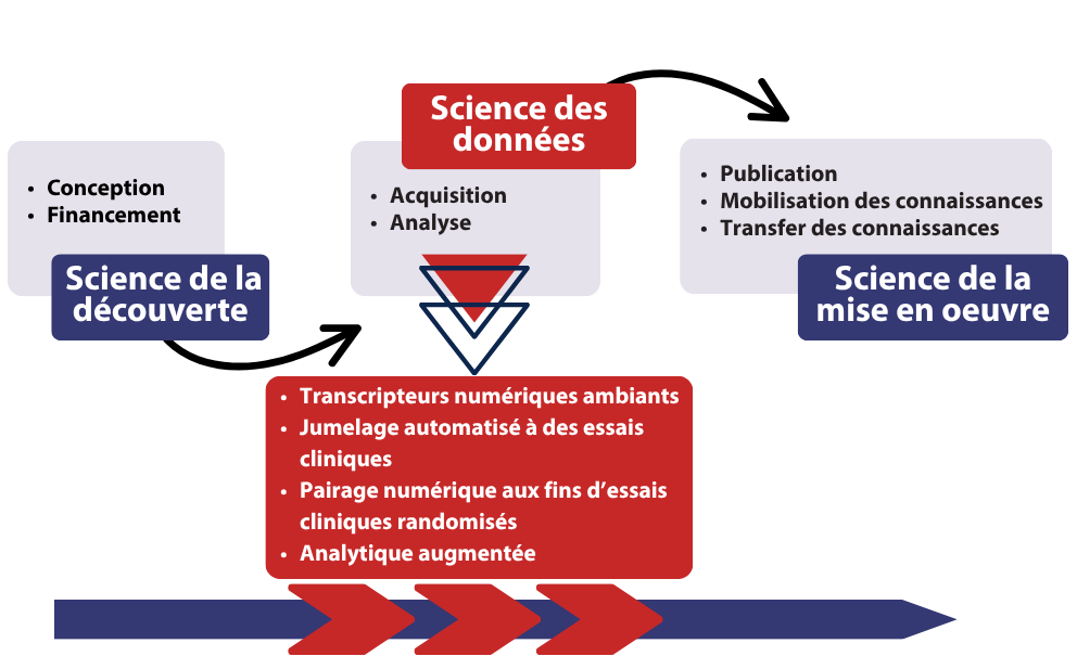 - La section bleue à l'intérieur illustre les piliers de la recherche : biomédicale, clinique, services de santé et santé populationnelle.
